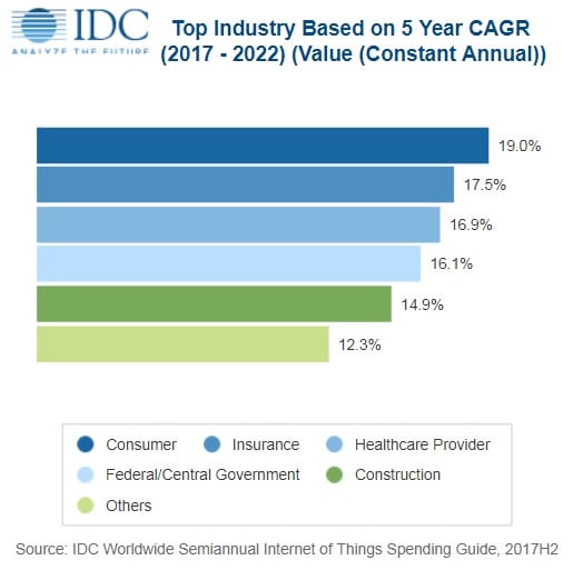 Selon cette étude, les 5 secteurs les plus dynamiques d’ici 2022 seront le commerce de détail (19% de croissance en moyenne), l’assurance (17,5%), la santé (16,9%), l’administration (16,1%) et le BTP (14,9%). « Le marché de l’IoT est à un tournant, explique Carrie MacGillivray, vice-Présidente d’IDC. Les projets sont en train de passer de l’état de proof of concept à des déploiements commerciaux. » IDC note toutefois que la croissance la plus rapide sera celle du marché de la voiture connectée et autonome (+29% par an), avec la montée en puissance des communications « véhicule à véhicule (V2V) et « véhicule à infrastructure » (V2I).